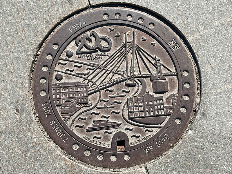 Любопытный юбилейный люк можно встретить на улицах Драммена. Обычно такие изделия посвящают круглым датам с момента основания города, но здесь другая история. Этот люк знаменует 175-летие объединения города с другим населенным пунктом Стремсе.